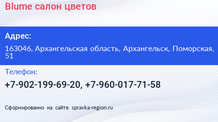 Blume, салон цветов по адресу 163046, Архангельская область, Архангельск, Поморская, 51 в дальнейшем Организация, размещена в следующих категориях: