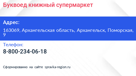 Буквоед, книжный супермаркет по адресу 163069, Архангельская область, Архангельск, Поморская, 9 в дальнейшем Организация, размещена в следующих категориях: