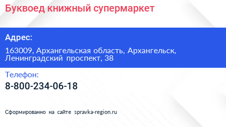 Буквоед, книжный супермаркет по адресу 163009, Архангельская область, Архангельск, Ленинградский проспект, 38 в дальнейшем Организация, размещена в следующих категориях: