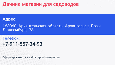 Дачник, магазин для садоводов по адресу 163060, Архангельская область, Архангельск, Розы Люксембург, 78 в дальнейшем Организация, размещена в следующих категориях: