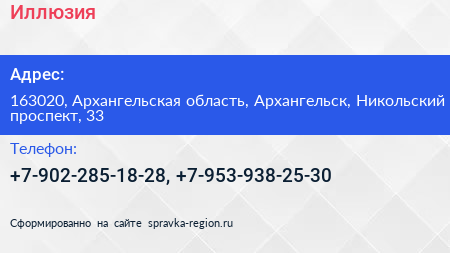 Иллюзия по адресу 163020, Архангельская область, Архангельск, Никольский проспект, 33 в дальнейшем Организация, размещена в следующих категориях: