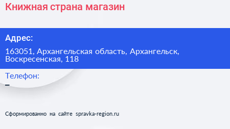 Книжная страна, магазин по адресу 163051, Архангельская область, Архангельск, Воскресенская, 118 в дальнейшем Организация, размещена в следующих категориях: