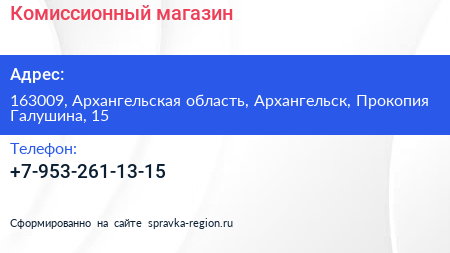 Комиссионный магазин по адресу 163009, Архангельская область, Архангельск, Прокопия Галушина, 15 в дальнейшем Организация, размещена в следующих категориях: