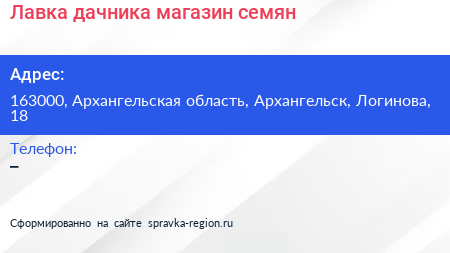 Лавка дачника, магазин семян по адресу 163000, Архангельская область, Архангельск, Логинова, 18 в дальнейшем Организация, размещена в следующих категориях: