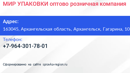 МИР УПАКОВКИ, оптово-розничная компания по адресу 163045, Архангельская область, Архангельск, Гагарина, 10 в дальнейшем Организация, размещена в следующих категориях: