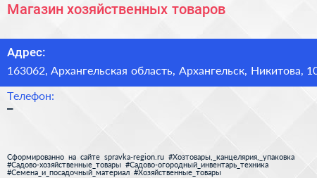 Магазин хозяйственных товаров по адресу 163062, Архангельская область, Архангельск, Никитова, 10 в дальнейшем Организация, размещена в следующих категориях: