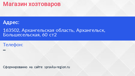 Магазин хозтоваров по адресу 163502, Архангельская область, Архангельск, Большесельская, 60 ст2 в дальнейшем Организация, размещена в следующих категориях: