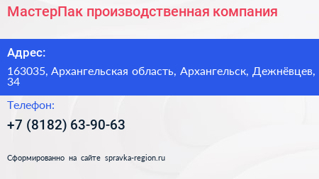 МастерПак, производственная компания по адресу 163035, Архангельская область, Архангельск, Дежнёвцев, 34 в дальнейшем Организация, размещена в следующих категориях: