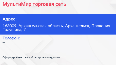 МультиМир, торговая сеть по адресу 163009, Архангельская область, Архангельск, Прокопия Галушина, 7 в дальнейшем Организация, размещена в следующих категориях: