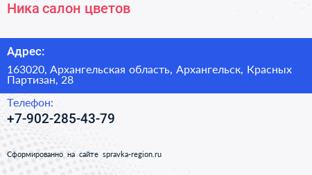 Ника, салон цветов по адресу 163020, Архангельская область, Архангельск, Красных Партизан, 28 в дальнейшем Организация, размещена в следующих категориях: