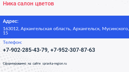 Ника, салон цветов по адресу 163012, Архангельская область, Архангельск, Мусинского, 15 в дальнейшем Организация, размещена в следующих категориях:
