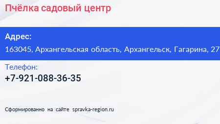 Пчёлка, садовый центр по адресу 163045, Архангельская область, Архангельск, Гагарина, 27 в дальнейшем Организация, размещена в следующих категориях: