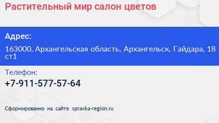 Растительный мир, салон цветов по адресу 163000, Архангельская область, Архангельск, Гайдара, 18 ст1 в дальнейшем Организация, размещена в следующих категориях: