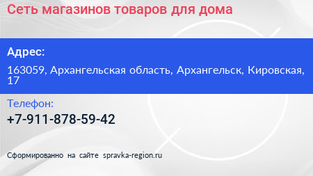 Сеть магазинов товаров для дома по адресу 163059, Архангельская область, Архангельск, Кировская, 17 в дальнейшем Организация, размещена в следующих категориях: