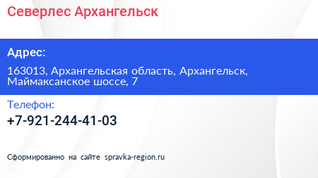 Северлес-Архангельск по адресу 163013, Архангельская область, Архангельск, Маймаксанское шоссе, 7 в дальнейшем Организация, размещена в следующих категориях: