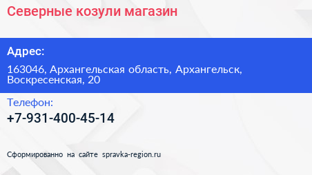 Северные козули, магазин по адресу 163046, Архангельская область, Архангельск, Воскресенская, 20 в дальнейшем Организация, размещена в следующих категориях: