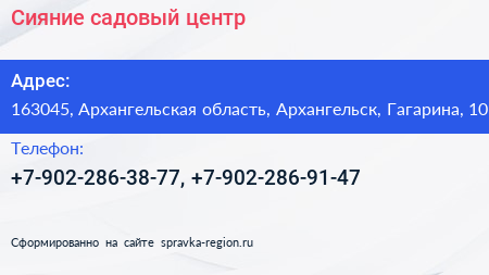 Сияние, садовый центр по адресу 163045, Архангельская область, Архангельск, Гагарина, 10 в дальнейшем Организация, размещена в следующих категориях: