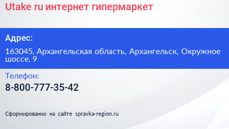 Utake.ru, интернет-гипермаркет по адресу 163045, Архангельская область, Архангельск, Окружное шоссе, 9 в дальнейшем Организация, размещена в следующих категориях: