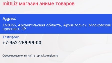 miDLiz, магазин аниме-товаров по адресу 163065, Архангельская область, Архангельск, Московский проспект, 49 в дальнейшем Организация, размещена в следующих категориях:
