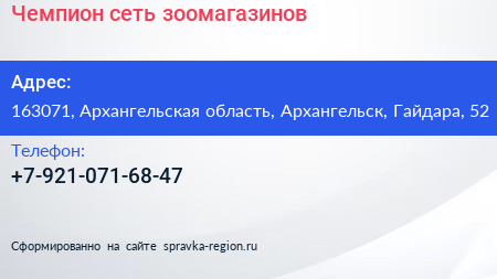 Чемпион, сеть зоомагазинов по адресу 163071, Архангельская область, Архангельск, Гайдара, 52 в дальнейшем Организация, размещена в следующих категориях: