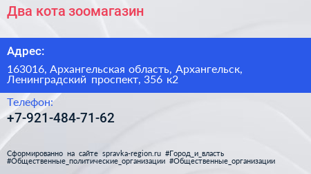 Два кота, зоомагазин по адресу 163016, Архангельская область, Архангельск, Ленинградский проспект, 356 к2 в дальнейшем Организация, размещена в следующих категориях: