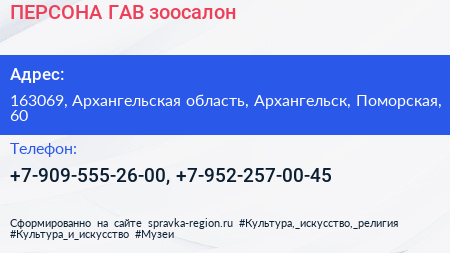 ПЕРСОНА ГАВ, зоосалон по адресу 163069, Архангельская область, Архангельск, Поморская, 60 в дальнейшем Организация, размещена в следующих категориях:
