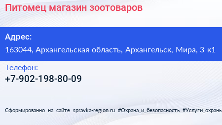 Питомец, магазин зоотоваров по адресу 163044, Архангельская область, Архангельск, Мира, 3 к1 в дальнейшем Организация, размещена в следующих категориях:
