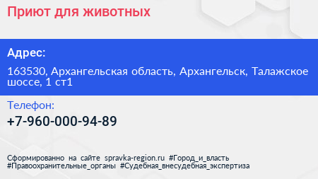 Приют для животных по адресу 163530, Архангельская область, Архангельск, Талажское шоссе, 1 ст1 в дальнейшем Организация, размещена в следующих категориях: