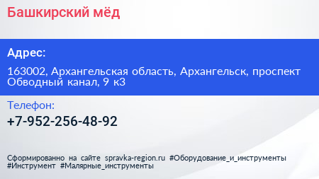Башкирский мёд по адресу 163002, Архангельская область, Архангельск, проспект Обводный канал, 9 к3 в дальнейшем Организация, размещена в следующих категориях: