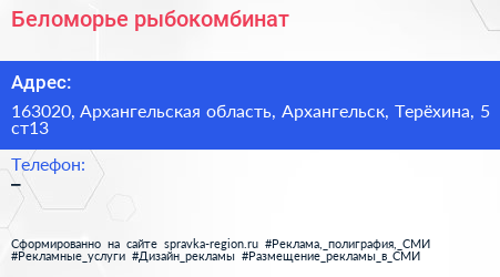 Беломорье, рыбокомбинат по адресу 163020, Архангельская область, Архангельск, Терёхина, 5 ст13 в дальнейшем Организация, размещена в следующих категориях: