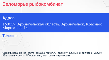 Беломорье, рыбокомбинат по адресу 163059, Архангельская область, Архангельск, Красных Маршалов, 14 в дальнейшем Организация, размещена в следующих категориях: