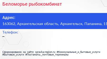 Беломорье, рыбокомбинат по адресу 163062, Архангельская область, Архангельск, Папанина, 11 в дальнейшем Организация, размещена в следующих категориях: