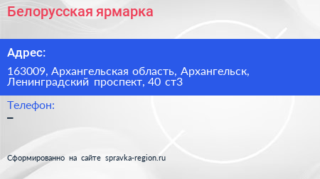 Белорусская ярмарка по адресу 163009, Архангельская область, Архангельск, Ленинградский проспект, 40 ст3 в дальнейшем Организация, размещена в следующих категориях: