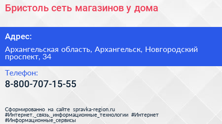 Бристоль, сеть магазинов у дома по адресу Архангельская область, Архангельск, Новгородский проспект, 34 в дальнейшем Организация, размещена в следующих категориях: