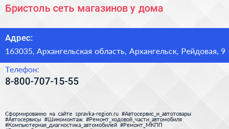 Бристоль, сеть магазинов у дома по адресу 163035, Архангельская область, Архангельск, Рейдовая, 9 в дальнейшем Организация, размещена в следующих категориях: