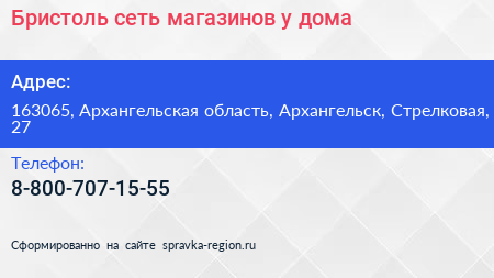 Бристоль, сеть магазинов у дома по адресу 163065, Архангельская область, Архангельск, Стрелковая, 27 в дальнейшем Организация, размещена в следующих категориях: