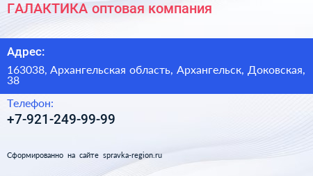 ГАЛАКТИКА, оптовая компания по адресу 163038, Архангельская область, Архангельск, Доковская, 38 в дальнейшем Организация, размещена в следующих категориях: