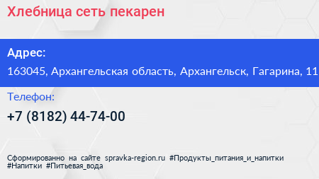 Хлебница, сеть пекарен по адресу 163045, Архангельская область, Архангельск, Гагарина, 11 в дальнейшем Организация, размещена в следующих категориях: