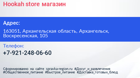 Hookah store, магазин по адресу 163051, Архангельская область, Архангельск, Воскресенская, 105 в дальнейшем Организация, размещена в следующих категориях: