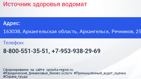 Источник здоровья, водомат по адресу 163038, Архангельская область, Архангельск, Речников, 25 в дальнейшем Организация, размещена в следующих категориях: