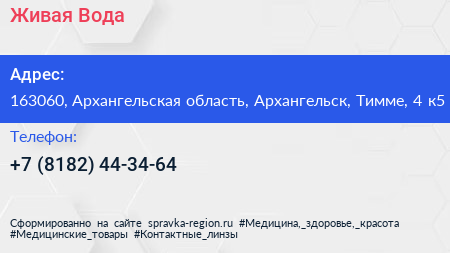 Живая Вода по адресу 163060, Архангельская область, Архангельск, Тимме, 4 к5 в дальнейшем Организация, размещена в следующих категориях: