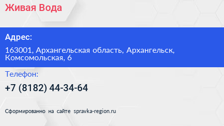 Живая Вода по адресу 163001, Архангельская область, Архангельск, Комсомольская, 6 в дальнейшем Организация, размещена в следующих категориях:
