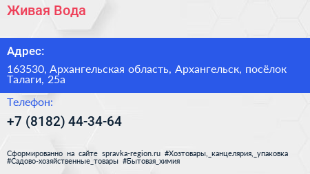 Живая Вода по адресу 163530, Архангельская область, Архангельск, посёлок Талаги, 25а в дальнейшем Организация, размещена в следующих категориях: