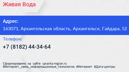 Живая Вода по адресу 163071, Архангельская область, Архангельск, Гайдара, 52 в дальнейшем Организация, размещена в следующих категориях: