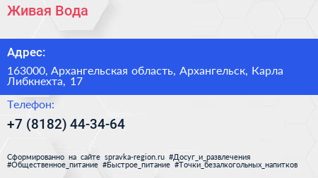 Живая Вода по адресу 163000, Архангельская область, Архангельск, Карла Либкнехта, 17 в дальнейшем Организация, размещена в следующих категориях: