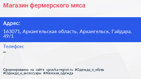 Магазин фермерского мяса по адресу 163071, Архангельская область, Архангельск, Гайдара, 49/1 в дальнейшем Организация, размещена в следующих категориях: