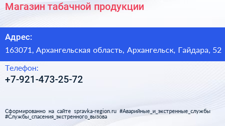 Магазин табачной продукции по адресу 163071, Архангельская область, Архангельск, Гайдара, 52 в дальнейшем Организация, размещена в следующих категориях: