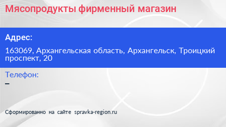 Мясопродукты, фирменный магазин по адресу 163069, Архангельская область, Архангельск, Троицкий проспект, 20 в дальнейшем Организация, размещена в следующих категориях: