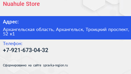 Nuahule Store по адресу Архангельская область, Архангельск, Троицкий проспект, 52 к1 в дальнейшем Организация, размещена в следующих категориях: