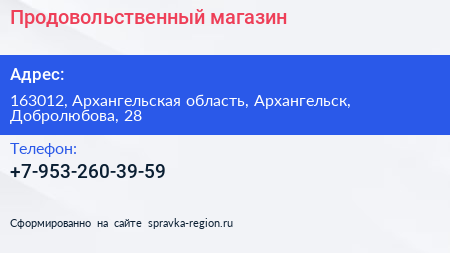 Продовольственный магазин по адресу 163012, Архангельская область, Архангельск, Добролюбова, 28 в дальнейшем Организация, размещена в следующих категориях: